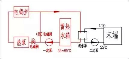 在晚間谷電價的時間段中,空氣源熱泵機組把蓄熱水箱的水溫從35℃提升到50℃,電鍋爐再把水溫提升到95℃。