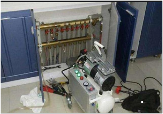 這種地暖清洗方法不需藥劑,不拆卸地暖管,清洗較徹底。其獨特的清洗原理可同時清洗地暖分集水器主管路及閥門,避免長期結垢導致閥門堵塞現象。這種清洗方法的不足之處在于,施工時受空間限制,特別是某些用戶的地暖分集水器安裝在隱蔽處,且分集水器兩端與墻壁距離過近,從而使施工更加困難。