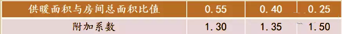 6、局部地面輻射供暖系統(tǒng)熱負荷,可按整個房間全面輻射供暖所算得的熱負荷乘以該區(qū)域面積與所在房間面積的比值和下表中所規(guī)定附加系數(shù)確定。
