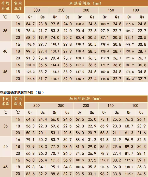 管外徑為20mm、填充層厚度為50mm、聚苯乙烯泡沫塑料絕熱層厚度20mm、供回水溫差10℃(水泥或陶瓷地面,熱阻R=0.02(㎡.k/w))