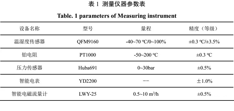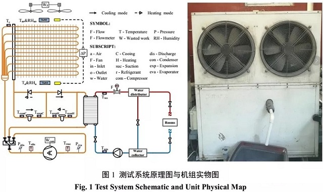 測試系統(tǒng)對空氣源熱泵的空氣側、制冷劑側與制取熱水側的運行參數(shù)以及能耗情況進行實時監(jiān)測。測試機組原理圖與實物圖如圖1中所示,在壓縮機吸/排氣管上分別設有溫度和壓力傳感器監(jiān)測壓縮機的吸/排氣溫度和壓力,在水側利用鉑電阻PT1000測量機組的進/出水溫度,利用電磁流量計測量水流量。其中主要的測量儀器參數(shù)如表1所示。