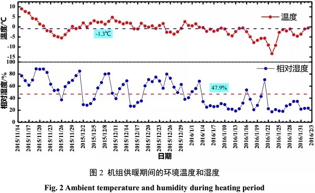 測試期為2015年11月15日至2016年2月2日。為詳細考察空氣源熱泵在測試期內(nèi)的運行性能,尤其在低溫工況下的性能,全面測試了室外溫濕度,壓縮機吸排氣溫度和壓力、機組制熱量、能耗和COP等參數(shù),并對相關的參數(shù)進行整理分析。