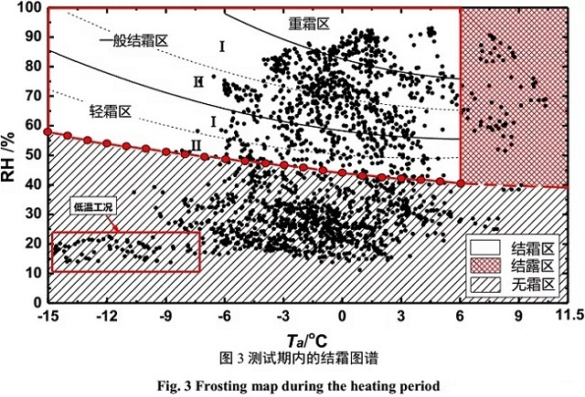 由圖可知,隨著供暖期的推進,環(huán)境溫度呈下降趨勢,在2016年1月23日達到最低溫度;相對濕度變化幅度較大,測試中后期,環(huán)境相對濕度較低,北京氣候呈現(xiàn)“干冷”的特點。為直觀獲得測試期內(nèi)機組不同運行工況下的結霜和結露情況,根據(jù)朱佳鶴[23,24]等人提出的多區(qū)域結霜圖譜,得出如圖3所示的結霜工況分布圖。