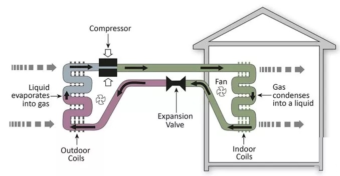 Expansion Valve(膨脹閥)、Outdoor Coils(室外換熱器)、Liquid evaporates into gas(液體蒸發(fā)成氣體)、Compressor(壓縮機)、Fan(風(fēng)扇)、Gas condenses into a liquid(氣體凝結(jié)成液體)、Indoor Coils(室內(nèi)換熱器)