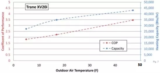 (圖1顯示了由Trane提供的具有報道的HSPF = 10(NEEP,2014)的XVASHi型號的ccASHP的加熱容量和COP值。)、