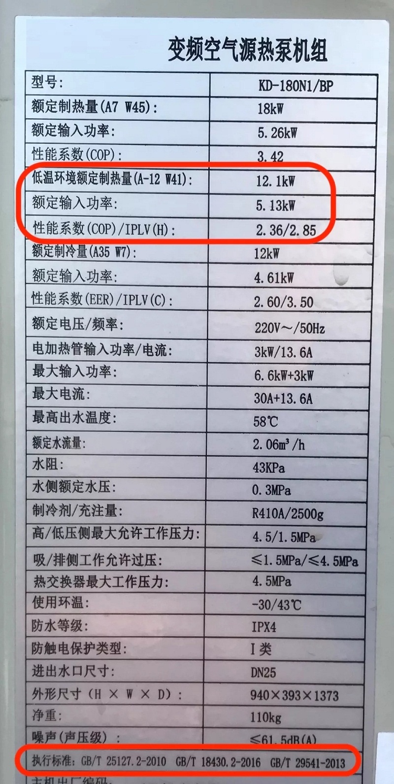 從其銘牌上我們可以看出,該機(jī)型執(zhí)行的標(biāo)準(zhǔn)是GB/T 18430.2。該標(biāo)準(zhǔn)適合于風(fēng)冷熱泵,其制熱名義工況是7℃。而根據(jù)北京農(nóng)委的要求,低溫空氣源熱泵的送檢要求為: