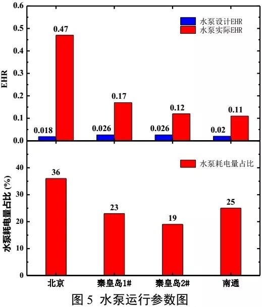 圖5為各項目水泵設計和實際EHR,以及水泵耗電量占比圖。由圖可得,北京某辦公樓、秦皇島1#辦公樓、2#辦公樓、及南通某辦公樓項目的輸配系統在測試期內的耗電輸熱比分別為0.47、0.17、0.12、0.11,遠遠高于水泵設計EHR。測試期內,四個項目水泵耗電量占系統耗電量比例分別為36%、23%、19%、25%。水泵能耗占比過大,是COPsh值低下的重要原因。