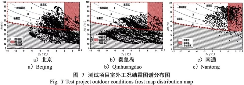 各項目室外工況在結霜圖譜分布如圖7所示,由此可見,北京和秦皇島地區室外工況較為干燥,超過50%室外工況位于非結霜區,位于結霜區的工況僅占43%和32%,極少有重霜區工況。南通地區室外氣溫相對較高,但其相對濕度較大,約30%的室外工況位于一般結霜區和重霜區。由此可見,不同氣候區室外工況差異較大,機組應按照室外溫濕度情況按需除霜,但是目前實際工程多采用溫度-時間(TT)除霜控制方法,該除霜控制方法未考慮不同氣候區的環境工況差異性,導致“誤除霜”事故頻發。