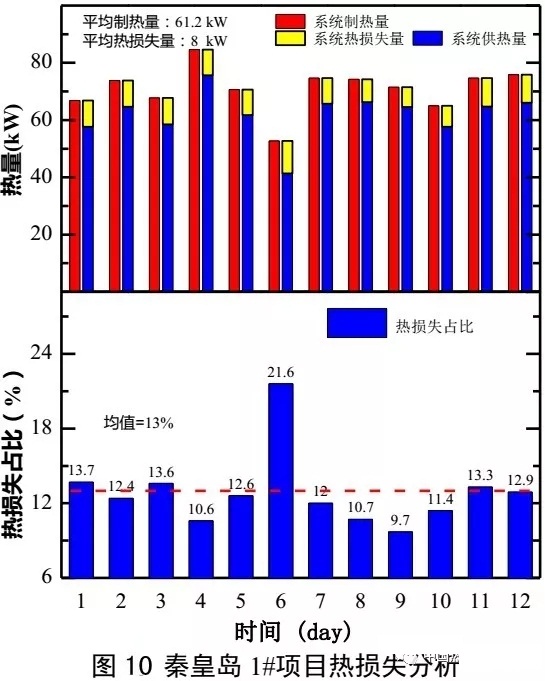 圖10為試驗測試結果,由圖可知,試驗期間系統制熱量平均值為61.2kW,供熱量平均值為53.2kW,熱損失量平均值為8kW,熱損失量占系統總制熱量的13%,最高日可達21.6%,造成了嚴重能量浪費。