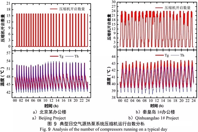 圖9為典型日北京、秦皇島1#辦公樓項目空氣源熱泵系統壓縮機運行臺數變化圖,北京某辦公樓項目空氣源熱泵系統無群控策略,機組根據回水溫度機組同啟同停。