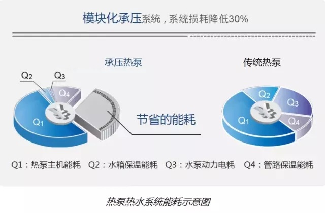 模塊化承壓熱泵系統與普通開式熱泵系統相比,在系統輸送環節,還可極大程度地降低系統中水箱散熱損失、水泵的動力電能消耗等,從而大幅節省運營成本。