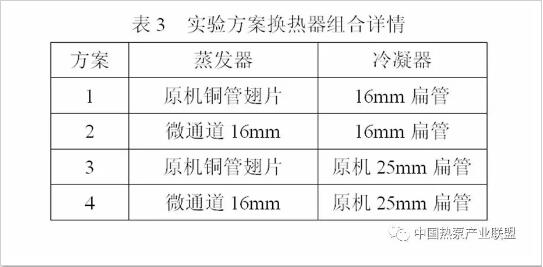 本文為了更好的評價替代方案的蒸發器和冷凝器的性能,進行了四組不同換熱器組合的實驗,詳細的實驗方案如表3所示。