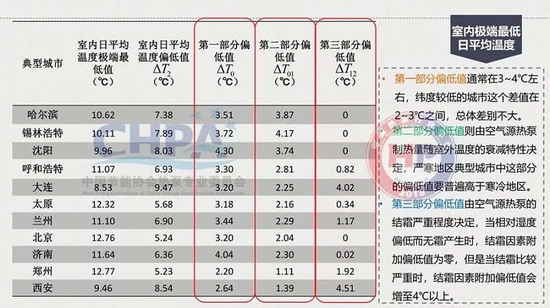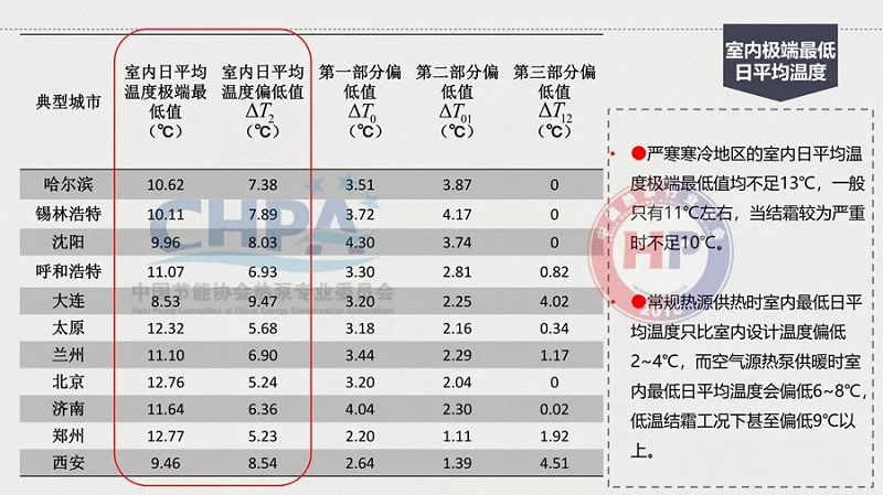 二是室內極端最低日平均氣溫更低。常規熱源供熱時室內最低日平均溫度只比室內設計溫度偏低2—4℃,而空氣源熱泵供暖時室內最低日平均溫度會偏低6—8℃,低溫結霜工況下甚至偏低9℃以上。