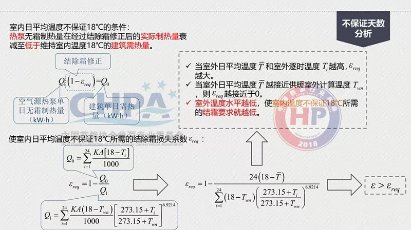 那么,怎么由18℃降到13℃?原因是在統計規定室外計算溫度的時候,已經有了不保證5天的室內空氣質量。在這樣的情況下,它的偏差就比較大了。其中,室內日平均溫度不保證18℃的條件是熱泵無霜制熱量在經過結除霜修正后的實際制熱量衰減至低于維持室內溫度18℃的建筑需熱量。