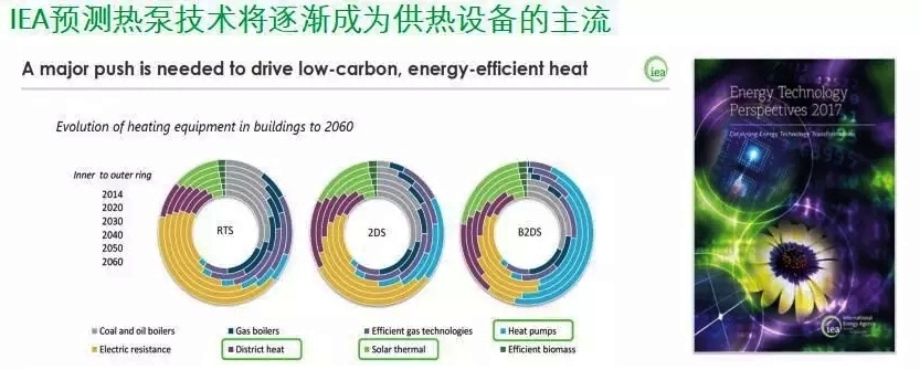 如上圖所示,在國際能源署2017能源技術展望中指出,自2014年至2060年,隨著年份的不斷推移,空氣源熱泵供熱等(Heat pumps)、太陽能(Solar thermal)、燃氣壁掛爐(Gas boilers)等主要供熱產品所占比重也將會發生改變,隨著空氣源熱泵供熱等應用的逐年增長,在2030年將全球氣候升溫控制在2℃以內的總體目標就會得到逐步實現,甚至超越目標。