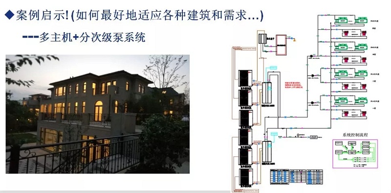 下圖是我們在杭州的一個(gè)大別墅案例,就采用了多主機(jī)+分次級泵系統(tǒng),空氣源熱泵可以和末端直接通迅對接同時(shí)控制對應(yīng)能力的壓縮機(jī)和次級泵的輸出,這里面運(yùn)用了很多感應(yīng)的技術(shù),用戶對現(xiàn)在這個(gè)系統(tǒng)總體上還是非常滿意的,特別是我們解決了極低負(fù)荷下(如只有兩人在家開一個(gè)房間的制冷)時(shí),水泵輸送功耗的問題,在大別墅里10%以下的低負(fù)荷運(yùn)行占據(jù)90%以上的時(shí)間比,因此,低負(fù)荷下的能效比對用戶而言就非常關(guān)鍵!目前我們的技術(shù)平臺完全支持個(gè)性化的要求,這是我們智能熱泵能做到的。